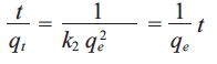 where qt and qe, as mentioned before, represent the concentrations of Pb or Zn adsorbed at any time t and the maximum adsorbed per unit mass of adsorbent at equilibrium, respectively, and k2 is the rate constant of the pseudo-second order adsorption. To obtain the value of k2, separation of the variables of equation (3) was made followed by integration and application of the same boundary conditions as before (qt = 0 at t = 0 and qt = qt at t = t), yielding the integrated rate law for pseudo-second-order reaction