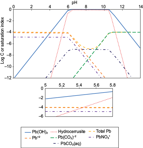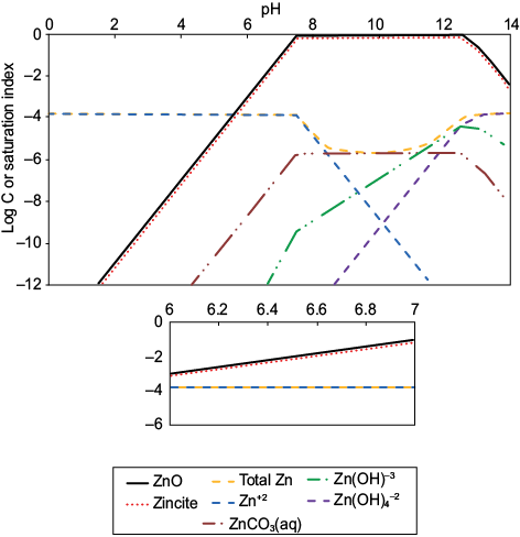 where IP is the ionic product and Ksp is the solubility product constant of the minerals. At the pH value in which SI is zero (IP = Ksp) the solution is saturated, so the solid phases may begin to appear. Based on these, to ensure conditions for maximum adsorption for cations before solids formation, the working pH values chosen were 5.8 for Pb(II) and 7.0 for Zn(II). At these values, the predominant dissolved species expected are: Pb+2, Pb(CO3)–2, PbNO3+ and PbCO3(aq); and Zn+2, Zn(OH)–3, Zn(OH)4–2 and ZnCO3(aq) for Pb(II) and Zn(II), respectively.