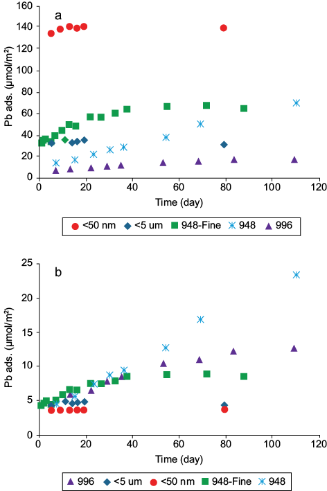 This behavior might be associated with slow diffusion of Pb(II) into magnetite aggregates, especially in sample 948. Pb diffusion in amorphous iron oxides HFO (Fe2O3·nH2O, n= 1–3) for periods that exceed 110 days has been reported by other authors (Fan et al. 2005, Xu et al. 2006). These authors reported that Pb(II) adsorption on HFO at pH 5.0 could be described by a two-step process: a fast initial adsorption of metal ion to the external surface, followed by a slow intraparticle diffusion step represented by a surface diffusivity of 2.5 × 10–15 cm2/s.