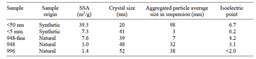 When data were normalized by SSA (Fig. 3b) neither congruency between adsorption data nor grouping around similar values of SSA and solid concentrations were obtained for magnetite samples. This behavior may be due to an artifact in the BET-SSA measurements, since these are performed in dry samples, in which magnetism might cause considerable and variable aggregation of particles. This aggregation under dry conditions may occur in different forms than in suspended samples, resulting in an incorrect measurement of this parameter when applied to aqueous suspension conditions. However, it is noteworthy that maximum adsorption normalized by SSA is directly correlated to particle size, suggesting that errors in SSA measurements are larger in the coarser magnetite samples. In this regard, the synthetic and smaller particles sized magnetites (< 50 nm and < 5 mm) yielded the lowest maxima computed (3.6 mmol/m2 and 4.8 mmol/m2, respectively), but closer to values shown for maximum anion adsorption on other Fe(III) oxides, such as goethite. The maxima for the remaining natural samples are extremely high and definitely suggest significant underestimation of available SSA.