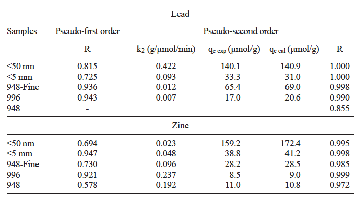 Comparison of correlation coefficients (R) of the linearized forms of both rate equations applied to the experimental adsorption data indicates that their behavior followed a pseudo-second order kinetic model (Table II). R values for both metals were 0.99 or higher for all magnetites, except for sample 948 (Table II), which yielded R values of 0.855 for Pb(II) and 0.972 for Zn(II). Also, for this latter sample, it was not possible to fit a pseudo-first order kinetic model because the concentration of Pb adsorbed was nowhere near equilibrium after 110 days, and thus qe was unknown.
