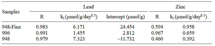 To verify that Pb(II) diffusion into natural samples may contribute to the slow equilibration shown, an intraparticle diffusion model was tested, based on equation (6). From table III it can be seen that for this metal natural samples had good linearity (regression coefficient, R ≥ 0.98) and the intraparticle diffusion coefficients for samples 948-fine, 996 and 948 had values of 6.2, 1.5 and 7.3 mmol/g/day, respectively. Also, table III shows that the plot of Pb adsorbed against square root of contact time did not have a zero intercept. This last result indicates that in addition to following intraparticle diffusion (e.g. in magnetite impurities), pseudo-second-order kinetics might also be a process influencing the kinetics of natural samples (Gupta and Bhattacharyya 2011). A similar result was reported by Sari et al. (2007), in a study of adsorption of Pb(II) on Turkish kaolinite.