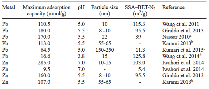 Previous Pb(II) adsorption work on magnetite nanoparticles with average sizes from 8 to 60 nm (Table IV), has shown equilibrium times achieved within the first 20-600 minutes of the experiments (Wang et al. 2011, Giraldo et al. 2013, Karami 2013, Wang et al. 2014). These times are considerably shorter than the times obtained with our natural magnetite samples, presumably because of the extremely high surface area exposed in nanoparticles, which allows fast diffusion of the ions from the bulk solution to the nanomagnetite surfaces (Nassar 2010, Wang et al. 2011).