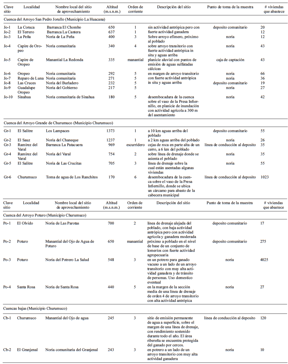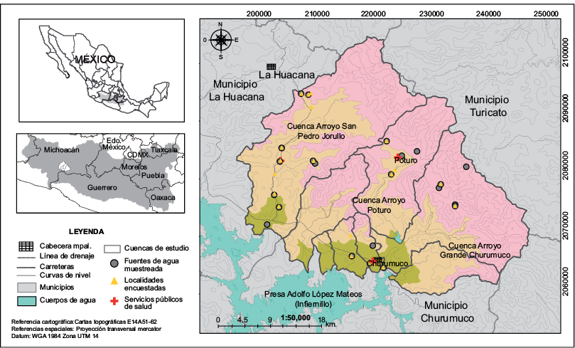 El estudio se realizó en un sistema hidrográfico de 1300 km2 que drena al embalse Adolfo López Mateos (Presa Infiernillo) en la parte baja de la cuenca del Río Balsas en la región de Tierra Caliente, Michoacán, México (Fig. 1). La cuenca del Balsas está dominada por dos tipos climáticos: cálido subhúmedo Aw0 y semiárido cálido BS1 (Trejo 1999). La precipitación anual promedio es de 650 mm si bien el 90 % precipita entre junio y octubre con un periodo seco que dura de 6 a 7 meses. El área es representativa del trópico seco del Pacífico mexicano y está caracterizado por la presencia de selvas bajas, un ecosistema nativo con interesantes y únicas adaptaciones a la sequía (Ceballos et al. 2010). Los pobladores radican en pequeñas localidades dispersas en un paisaje dominado por cerros y lomeríos, las cuales muestran rezagos sociales y económicos que las clasifican como de alta y muy alta marginación (CONAPO 2012). El agua doméstica es obtenida de pequeños escurrideros de las partes altas de cerros y manantiales permanentes o desde acuíferos aluviales someros en los cauces de arroyos transitorios. El aprovechamiento se realiza con infraestructura hídrica precaria. En sitios altos, se utilizan cajas de captación para conducir el agua por gravedad a los poblados; en las partes bajas, el agua se extrae de acuíferos aluviales mediante norias y equipos de bombeo. En ambos casos, el agua es conducida primero a los depósitos comunitarios y luego, mediante una red de distribución, a las viviendas. Los depósitos carecen de tratamiento de agua aunque en ocasiones existen casetas para la colocación de clorinadores que nunca han entrado en uso. En el periodo seco, cuando el agua es insuficiente, las familias buscan fuentes alternativas como pequeños manantiales o realizan excavaciones en los cauces secos de los arroyos.