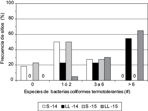 Las fuentes que abastecen de agua a las comunidades rurales del sistema hidrográfico Presa Infiernillo-Bajo Balsas tuvieron presencia de bacterias coliformes termoestables (CT) ampliamente distribuida en el tiempo y en el espacio. La severidad de dicha contaminación fue contrastante entre los periodos seco y lluvioso. El 100 % de los sitios muestreados (n = 22) tuvo presencia de CT a finales del periodo lluvioso en ambos años (2014 y 2015), mientras que la mejor condición se presentó a finales del periodo seco de 2014, con un 76 % de sitios afectados. Lo más frecuente fue la presencia de más de seis especies de CT por sitio analizado al final del periodo lluvioso, con más del 50 % de sitios en dicha condición (Fig. 2). La condición menos frecuente fue la ausencia de CT en alrededor del 20 % de los sitios muestreados al final del periodo seco.