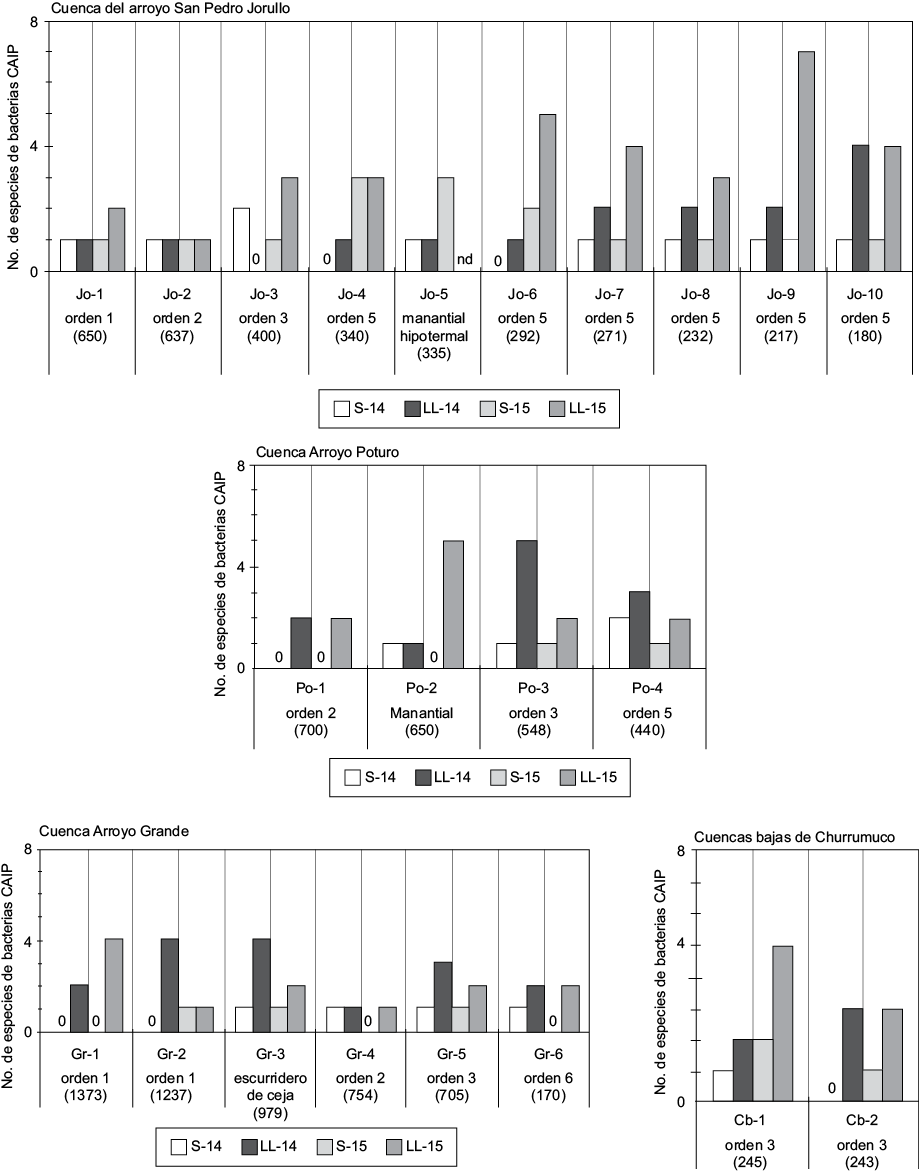 Además de la mayor dispersión espacial evidente en el aumento de sitios contaminados, se comprobó el incremento en la riqueza de especies tanto de CT como del subgrupo de CAIP durante el periodo lluvioso, con diferencias altamente significativas en la prueba de Wilcoxon (Cuadro IV). Contrario a lo esperado en [H3], el incremento en la severidad de la contaminación no mostró un patrón espacial regido por el orden de corriente de las líneas de drenaje donde se ubican los sitios de aprovechamiento. Los datos indican que el enriquecimiento de CT y CAIP en fuentes de agua es un fenómeno extendido dentro de todo el sistema hidrográfico. La figura 3 muestra que, de 22 sitios estudiados, 15 manifestaron incremento en la riqueza de CAIP en el periodo lluvioso en ambos años (2014 y 2015), seis sitios lo manifestaron sólo en una ocasión y un único sitio no presentó cambios entre periodos.