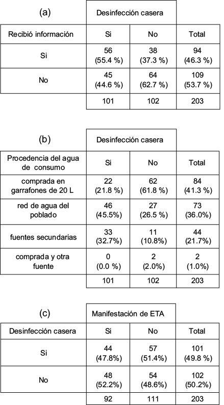 El 53.7 % de las 203 personas encuestadas manifestó no haber recibido información sobre el tema de la calidad microbiológica del agua y sus efectos en la salud familiar (Fig. 4a). Solamente 101 familias (49.2 %) exteriorizó el uso de algún tratamiento de desinfección del agua de consumo. La tabla de contingencia mostró una asociación positiva y consistente entre el acceso a la información y la adopción de prácticas de desinfección casera del agua en esta población. La cloración fue la principal práctica (74.5 %), con menor uso de plata coloidal de marca comercial (20.6 %); el hervido del agua fue poco mencionado.