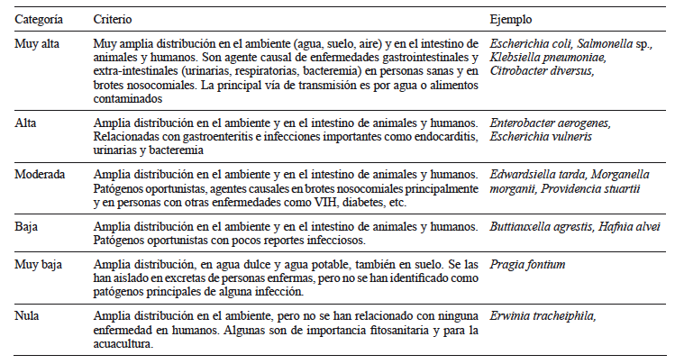 La calidad microbiológica del agua es medida por la presencia de bacterias coliformes termotolerantes capaces de fermentar lactosa a temperaturas de 44-45 °C, las que están asociadas a la presencia de material fecal. Escherichia coli y el género Salmonella son los principales indicadores de contaminación fecal, con efectos patogénicos severos para el ser humano. Otras especies de interés patogénico son Vibrio colera, especies del género Escherichia y algunas de los géneros Campylobacter, Enterobacter y Yersinia (Bain et al. 2014a). Otros géneros como Edwarsiella tienen efectos moderados o nulos en la salud humana, aunque pueden afectar la sanidad de especies agrícolas y silvestres (Crumlish et al. 2002).