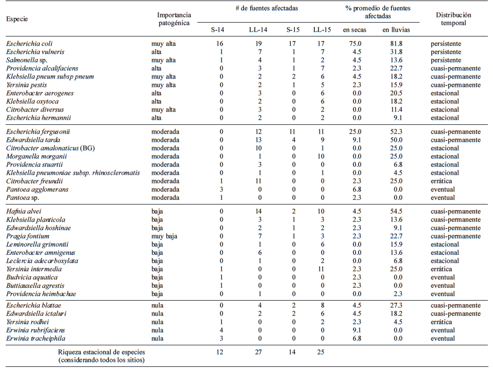 Se confirmó la presencia de 35 especies de la familia Enterobacteriaceae, pertenecientes a 17 géneros (Cuadro III). Diez especies fueron clasificadas como de importancia patogénica alta y muy alta (CAIP) pertenecientes a seis géneros: Escherichia, Salmonella, Klebsiella, Yersinia, Providencia y Citrobacter. De las diez especies, seis mostraron presencia ‘permanente’ y ‘cuasi-permanente’ a lo largo del periodo de muestreo, y las cuatro restantes tuvieron presencia ‘estacional’. E. coli mostró una amplia distribución espacial y temporal, con presencia en más del 72 % de los sitios de manera permanente. Las especies E. vulneris y Salmonella sp. mostraron una distribución espacial más restringida pero de manera permanente a lo largo del estudio. P. alcalifaciencis, K. pneumoniae subsp. pneumoniae y Y. pestis estuvieron presentes de manera ‘cuasi-permanente’ durante el estudio, con manifestación más restringida en alrededor del 15 % de las sitios. De las especies con presencia estacional, destacó Enterobacter aerogenes por su aparición en lluvias en más del 20 % de las fuentes y Citrobacter diversus con una menor distribución espacial pero con un muy alto impacto patogénico (Cuadro III). El inventario de CT incluyó nueve especies de importancia patogénica moderada de las cuales destacaron E. fergusonii y Edwardsiella tarda con presencia cuasi-permanente en más del 50 % de los sitios. Otras 16 especies detectadas no representan amenaza sanitaria para el ser humano, pero algunas sí lo son para especies silvestres y cultivadas como Edwarsiella ictaluri y Erwinia tracheiphila que producen patologías en peces y calabaza, respectivamente (Cuadro III).