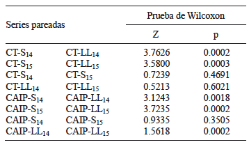 La dispersión de CT entre los sitios de aprovechamiento de agua dentro del sistema hidrográfico mostró diferencias altamente significativas entre los periodos seco y lluvioso en ambos años de muestreo (ZCT-2014 = 3.5870, p = 0.0003; ZCT-2015 = 4.1972, p = 0.0001). La severidad de la contaminación mostró un importante incremento en el periodo lluvioso y no en el seco, contrario a lo esperado en [H2], expresado en una mayor dispersión espacial de especies entre sitios de aprovechamiento. El mismo patrón se detectó al realizar la prueba de Wilcoxon solamente para las especies CAIP (ZCAIP-2014 = 2.8031, p = 0.0051; ZCF-2015 = 2.6656, p = 0.0077). Ello indicó que todo el grupo bacteriano, y no solamente las especies sin importancia sanitaria se diseminan en el periodo lluvioso. La prueba de Wilcoxon no detectó diferencias estadísticamente significativas en la dispersión espacial de cada especie en un mismo periodo climático entre diferentes años (Zsecas =1.8257, p = 0.068; Zlluvias = 1.6803, p = 0.093). Este resultado da certidumbre de la existencia de un patrón temporal en la dispersión de estas especies.