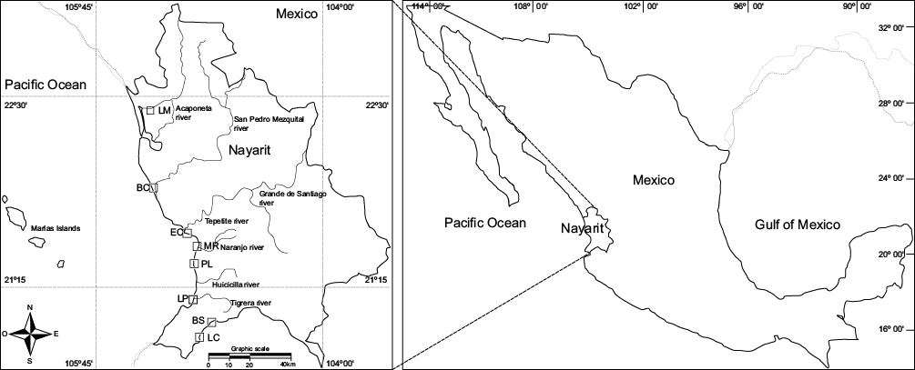 The sampling points Los Murillo (LM), La Boca de Camichín (BC), El Conchal (EC), Miramar (MR), and Platanitos (PL) are located in the Pacific coastal plain, under the influence of the state´s main rivers Acaponeta (LM), San Pedro Mezquital and Grande de Santiago (BC), as well as Huicicila and El Naranjo (EC, MR and PL) which drain areas of intensive agriculture. La Peñita de Jaltemba (LP) lies in the same Sierra de la Costa de Jalisco physiographic province as the two southernmost sampling stations La Cruz de Huanacaxtle (LC) and Bucerias (BS). However, LC and BS are located along the Bahía de Banderas coastline (Fig. 1), where tourism is an increasingly important economic activity, although maize, sorghum, tobacco and other main crops are produced through intensive, mainly irrigated agriculture (INEGI 2012).