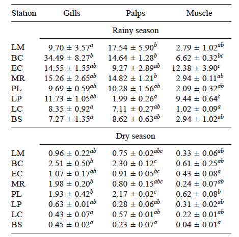 Oysters tend to adhere to hard substrates and to each other forming clumps of several individuals. Samples (2.5 to 5.5 cm Crassostrea sp. from four different clumps) were hand-collected at each sampling station at the beginning of September 2008 (rainy season) and end of February 2009 (dry season), and transported to the laboratory in separate plastic bags contained in an ice box. The selected tissues of each oyster were adductor muscles, gills and labial palps (Bocquené et al. 1997, Nardi et al. 2008). One g of each tissue of each oyster was homogenized separately in a 1300-D Polytron at 12 000 rpm for one minute in phosphate buffer in a 1:5 ratio (w/v) (García et al. 2006).
