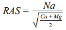 Donde RAS = Relación de adsorción de sodio; Na+, Ca2+, Mg2+ = concentración de sodio, calcio y magnesio en meq/L.