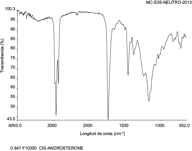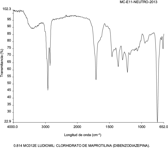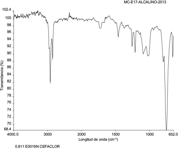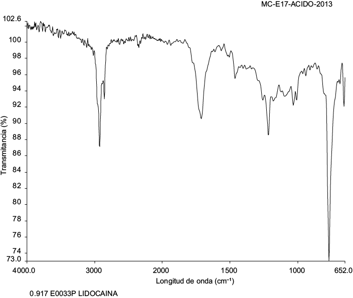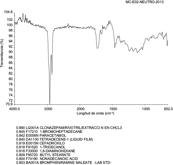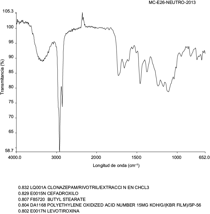 Espectroscopía de infrarrojo FT-IR. Los 180 espectros obtenidos se compararon con los de la Biblioteca Perkin Elmer Spectrum, integrada al programa del equipo FT-IR utilizado y se seleccionaron aquellos que presentaron una correlación (R) ≥ 0.80 con los espectros de referencia (Fig. 1, 2, 3, 4, 5 y 6). Los espectros seleccionados correspondieron a seis grupos de productos farmacéuticos: 1) antibióticos (cefadroxilo, cefaclor), 2) analgésicos (paracetamol), 3) anestésicos (lidocaína), 4) antihistamínicos (bromfeniramina), 5) ansiolíticos (clonazepam, maprotilina) y 6) hormonas y esteroides (levotiroxina, cis-androsterona). No se detectaron por esta técnica drogas de abuso. La metodología FT-IR identifica compuestos con base en la rotación/vibración que sufren las moléculas como consecuencia de la absorción de radiación (en este caso, en el infrarrojo medio o región de la “huella dactilar”). En muestras complejas se encuentran distintos tipos de átomos y enlaces y se genera una gran cantidad de vibraciones posibles que dificultan el análisis de los espectros resultantes; la identificación de moléculas, en este caso, requiere una purificación previa como la separación cromatográfica (Jee 2011). Estas características de FT-IR explican el reducido número de compuestos detectados por esta metodología, la cual se usa principalmente en el análisis cualitativo.