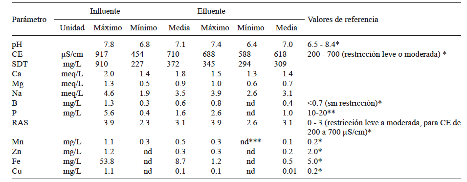 Los parámetros evaluados en las muestras obtenidas de las aguas residuales (influentes y efluentes de la PTAR), se presentan en el cuadro I. En los influentes se detectaron los metales Cu, Zn, Fe, Mn en concentraciones < 1 a 53.8 mg/L. El orden de concentración media fue: Fe > Mn > Zn > Cu. Diversos trabajos han mostrado que los metales Fe, Zn, Mn y Cu están entre los más abundantes en las aguas residuales sin tratar (Karvelas et al. 2003, Cherfi et al. 2015). Los parámetros Cu y Zn de los efluentes cumplen con la Norma Mexicana NOM-001-ECOL-1996 (SEMARNAT 1997) en relación con los límites máximos permisibles de contaminantes para descargas de aguas residuales en ríos y embalses naturales y artificiales para agua de usos agrícola, público urbano y de protección a la vida acuática. La norma no establece los límites para metales como Fe y Mn (SEMARNAT 1997). Otras normativas mencionan como límites máximos permitidos concentraciones de 40.0 y 4.0 mg/L para Fe y Mn, respectivamente, en aguas residuales tratadas (Karvelas et al. 2003). La concentración máxima de estos metales en los efluentes analizados se encuentra por debajo de estos límites. Se desconoce si los efluentes presentan otros elementos tóxicos como Cd, Cr, Pb, Hg y As que incluye la NOM-001-ECOL-1996. La concentración de P total no excede el límite marcado por la NOM-001-ECOL-1996 (20 mg/L) al igual que el pH (rango: 5 a 10). En los efluentes la CE y el B se redujeron en 13 y 33 %, respectivamente, en comparación con los influentes; la RAS no mostró variación indicando que la relación entre los cationes solubles Ca2+, Mg2+ y Na+ no fue afectada por el proceso de tratamiento en la PTAR. La baja eficiencia para reducir las sales solubles es característica de las PTAR que utilizan procesos primarios y secundarios (lodos activados), requiriéndose para aumentarla el empleo de procesos terciarios como membranas de intercambio iónico, ósmosis inversa o ultrafiltración, entre otros (Kornboonraksa 2016). Por otro lado, los valores de CE, B y RAS muestran que los efluentes analizados tienen un grado de restricción de leve a moderado para usarse en el riego de cultivos, en tanto que la concentración de los metales Cu, Zn, Fe y Mn no es restrictiva para este uso (Ayers y Westcot 1994). Estos efluentes pueden reutilizarse en el riego agrícola en suelos de buen drenaje, donde las sales que se adicionan con el agua de riego se lixivian reduciendo su acumulación en el perfil del suelo. En suelos con drenaje deficiente el riego con este tipo de flujos requiere medidas de manejo especiales para reducir los problemas de acumulación de sales que pueden afectar negativamente los rendimientos de los cultivos. La utilización de aguas residuales tratadas en el riego agrícola requiere, además, una medición periódica de los parámetros de fertilidad y calidad del suelo (Idowu et al. 2015).
