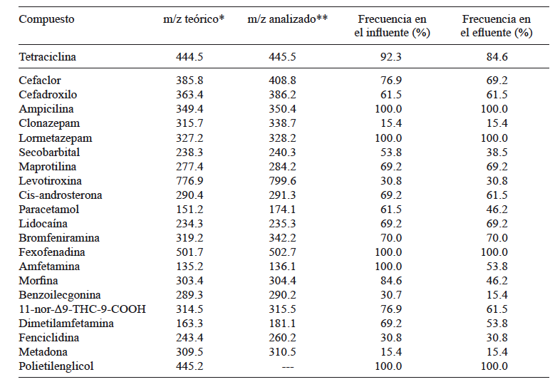 Espectrometría de masas ESI-MS-TOF. En el cuadro II se muestran las características y la frecuencia de los contaminantes emergentes detectados, tanto en el influente como en el efluente. La frecuencia se calculó como el porcentaje de las muestras donde se detectó el compuesto en relación con el total de muestras analizadas (n = 78). Se identificaron 22 compuestos correspondientes a ocho grupos: 1) antibióticos (tetraciclina, cefaclor, cefadroxilo, ampicilina), 2) antidepresivos y ansiolíticos (clonazepam, lormetazepam, secobarbital, maprotilina), 3) hormonas y esteroides (levotiroxina, cis-androsterona), 4) analgésicos (paracetamol), 5) anestésicos (lidocaína), 6) antihistamínicos (bromfeniramina, fexofenadina), 7) drogas de abuso (amfetamina, morfina, benzoilecgonina, 11-nor-∆9-THC-9-COOH, dimetilamfetamina, fenciclidina, metadona) y 8) otros (polietilenglicol). Estos resultados confirman lo encontrado con la metodología FT-IR donde se detectaron nueve de estos compuestos.
