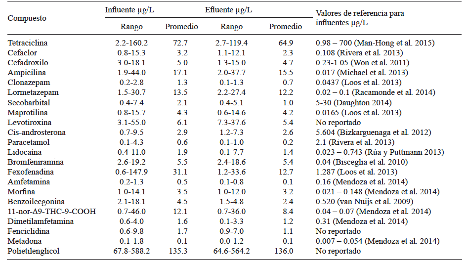 El cuadro III resume los resultados de la cuantificación por el análisis de espectrometría de masas ESI-MS-TOF para los contaminantes emergentes detectados. Las concentraciones de los compuestos identificados en cada extracto a pH 4.0, 7.0 y 10.0 se sumaron, obteniéndose 13 valores para calcular el rango y el promedio de concentraciones en influentes y efluentes. El polietilenglicol fue el compuesto detectado en mayor concentración media tanto en influentes como efluentes (135 µg/L). En los efluentes, la tetraciclina, ampicilina y lormetazepam fueron los productos farmacéuticos de mayor concentración media (64.9, 15.5 y 12.2 µg/L, respectivamente). Considerando la concentración media en los influentes, se observó que solamente los compuestos secobarbital, cis-androsterona y paracetamol fueron menores a los valores de referencia reportados por otros autores (Daughton 2014, Bizkarguenaga et al. 2012, Rivera et al. 2013), mientras que la tetraciclina estuvo dentro del rango reportado ( Man-Hong et al. 2015) y 15 compuestos excedieron los valores de referencia, con extremos de 2.4 veces para la metadona y 1007 veces para la ampicilina; no se encontraron reportes sobre valores de referencia para levotiroxina, fenciclidina y polietilenglicol. Como grupo de compuestos, los antibióticos presentaron las mayores concentraciones medias en los efluentes (21.8 µg/L), seguidos por los antihistamínicos (9.1 µg/L), ansiolíticos (4.2 µg/L), hormonas y esteroides (4.0 µg/L) y drogas de abuso (2.4 µg/L). Los antibióticos es el grupo de medicamentos que preferentemente ingieren los consumidores en México (PROFECO 2010) y que hasta hace poco tiempo podían adquirirse libremente en las farmacias. Esta condición y el hecho de que en la metodología utilizada (ESI-MS-TOF) no se incluyó una separación cromatográfica, podrían explicar las altas concentraciones detectadas. No obstante, los datos obtenidos en este trabajo permiten un análisis panorámico de los grupos de contaminantes emergentes presentes en estas aguas y constituyen una base para diseñar futuras investigaciones sobre los problemas ecotoxicológicos que pueden generar estos compuestos en la zona donde se usan estas aguas residuales.