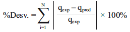 donde N es el número de datos experimentales, qexp (mg/g) es la capacidad de bioadsorción de Pb (II) experimental obtenida con la ecuación 1 y qpred (mg/g) es la capacidad de bioadsorción de Pb (II) predicha con los modelos de isotermas.