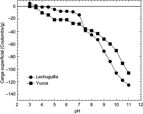 Aunado a lo anterior, se determinó el PCC a partir de las distribuciones de carga superficial de la lechuguilla y la yuca que se muestran en la figura 1. El PCC de la lechuguilla fue de 3.25 y el de la yuca de 3.00, lo que confirmó que ambos materiales son de carácter ácido y la diferencia entre estos valores se atribuyó a las variaciones de la concentración de sitios ácidos totales presentes en la superficie de los bioadsorbentes. Además, los valores estimados de PCC son similares a los valores que han sido reportados por otros autores para distintos materiales bioadsorbentes (Hamissa et al. 2010, Asberry et al. 2014).
