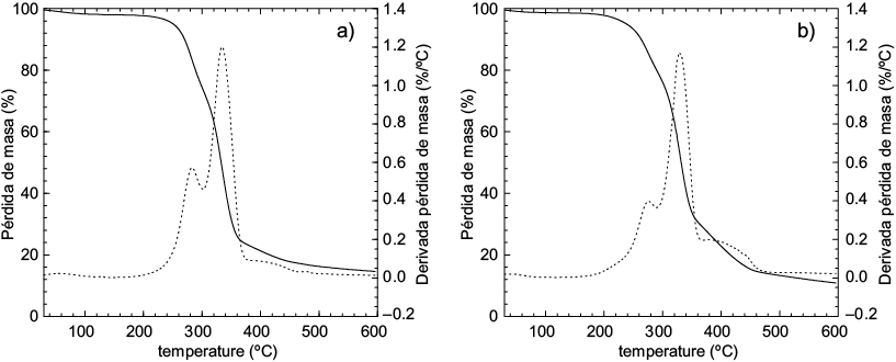 En las figuras 2a y 2b se ilustran los termogramas de la descomposición de la lechuguilla y yuca, respectivamente. En ambos casos, es posible apreciar tres regiones características en la descomposición de fibras vegetales que corresponden a la degradación de hemicelulosa, celulosa y lignina, en los intervalos de 200 a 330 °C, 200 a 450 °C y 400 a 600 °C, respectivamente (Conesa 2000). La descomposición de la celulosa en ambos materiales constituye el principal proceso de degradación, lo cual era de esperarse, pues esta macromolécula es el principal componente de las fibras vegetales y se estimaron pérdidas de peso del 50.3 y 47.5 % p/p para la lechuguilla y la yuca, respectivamente. Respecto a la hemicelulosa, fueron del 20.7 y 17.2 % p/p y para la lignina fueron del 9.6 y 17.7 % p/p. Con base en esta información se concluyó que la yuca es un material con un mayor contenido de lignina.