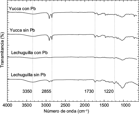 Los espectros al infrarrojo de las muestras de lechuguilla y yuca libres y saturadas con Pb (II) se obtuvieron en un espectrofotómetro Thermo Scientific, modelo Nicolet iS10 usando la técnica de reflectancia total atenuada (ATR).
