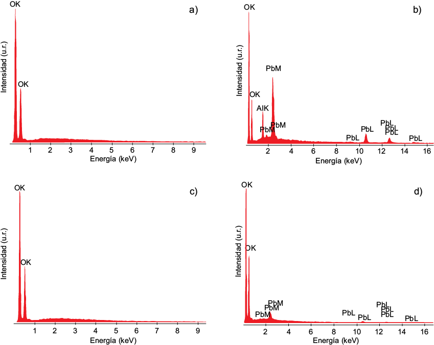 En la figuras 4a y 4c se ilustran imágenes del ESEM de las muestras de lechuguilla y yuca, respectivamente. En ellas se observa la textura de las muestras y se corrobora su naturaleza fibrosa, propia de los materiales lignocelulósicos los cuales están conformados por filamentos. Por otra parte, las figuras 4b y 4d ilustran las imágenes del ESEM de las muestras de lechuguilla y yuca con Pb (II) bioadsorbido, respectivamente. En el caso de la muestra de lechuguilla es posible apreciar micropartículas aglomeradas en la superficie del material, lo que indica un mecanismo de microprecipitación; mientras que la muestra de yuca no presentó microprecipitados, sino que el plomo se bioadsorbió en toda la superficie. La presencia del plomo en la superficie de los materiales se confirmó por medio del análisis elemental realizado por espectroscopía de energía dispersiva de rayos-X (EDS) acoplada al ESEM. Los espectrogramas de energía dispersiva de cada muestra fueron obtenidos de las zonas señaladas en la figura 4 y se ilustran en la figura 5. Aunque el área de análisis por EDS en la muestra de yuca fue mayor que la de la lechuguilla, la intensidad de la señal de Pb (II) detectada con respecto al pico del carbón fue menor y esto se asocia a la microprecipitación de Pb (II) que ocurre sobre la muestra de lechuguilla y que se relaciona con la atenuación general de su espectro FTIR (Fig. 3). Lo anterior revela que el Pb (II) se remueve por distintos mecanismos en ambos materiales.