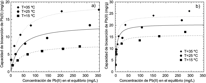 Los resultados del efecto de la temperatura de la solución sobre la capacidad de bioadsorción de Pb (II), se ilustran en las figuras 7a y 7bpara la lechuguilla y la yuca, respectivamente. El intervalo de temperaturas estudiado fue de 15 a 35 °C a un pH = 5.0. Los resultados revelaron que la capacidad de bioadsorción de Pb (II) de ambos materiales aumenta al incrementarse la temperatura de la solución. Las capacidades máximas de bioadsorción de Pb (II) de la lechuguilla y la yuca se incrementaron 1.72 y 1.45 veces y 1.29 y 1.18 veces al aumentar la temperatura de 15 a 25 °C y de 25 a 35 °C, respectivamente. Esto indica que la bioadsorción de Pb (II) sobre la lechuguilla y la yuca es un proceso endotérmico.
