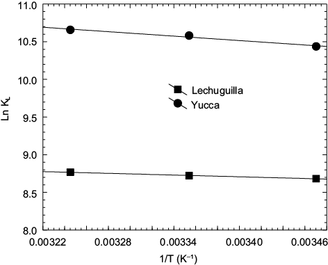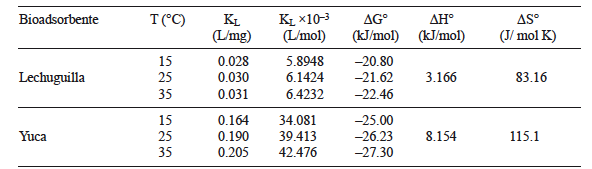 Los parámetros termodinámicos ΔH° y ΔS° se estimaron a partir de una regresión lineal de los datos del gráfico de Ln KL contra 1/T (Fig. 8) y con la ecuación 5 se calcularon los valores de ΔG°. Los parámetros termodinámicos evaluados para el proceso de bioadsorción de Pb (II) sobre los bioadsorbentes se muestran en el cuadro III. Los valores negativos de ΔG° a las temperaturas estudiadas indican que la bioadsorción de Pb (II) sobre la lechuguilla y la yuca es espontánea. En el estudio del efecto de la temperatura en la isoterma de bioadsorción de Pb (II) se determinó que la bioadsorción de Pb (II) sobre estos materiales es endotérmica. Los valores positivos de ΔH° estimados corroboran la naturaleza endotérmica de la bioadsorción de Pb (II) de ambos materiales. Los valores positivos de ΔS° muestran la afinidad del Pb (II) en solución por los bioadsorbentes. Los valores de los parámetros termodinámicos del equilibrio de bioadsorción de Pb (II) sobre la yuca fueron mayores que los obtenidos para la lechuguilla, lo cual indica que existe una mayor afinidad del Pb (II) por la yuca y por ello las capacidades de bioadsorción de este metal, a los distintos pH y temperaturas de solución, son mayores que las de la lechuguilla y esto se atribuyó al mayor contenido de sitios ácidos totales en este material.