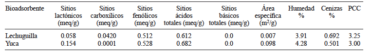 Las propiedades fisicas, químicas y de textura de las muestras de lechuguilla y yuca se muestran en el cuadro I. Los resultados revelaron que ambos materiales son predominantemente de carácter ácido ya que no se lograron cuantificar sitios básicos en la superficie de las muestras analizadas. Por otra parte, se encontró que la concentración de los sitios ácidos es ligeramente mayor en las muestras de yuca. También se observó que la concentración de sitios ácidos en ambas muestras disminuye en el orden siguiente: fenólicos > lactónicos > carboxílicos. La predominancia de los sitios fenólicos frente a los otros tipos de grupos cuantificados (láctonicos y carboxílicos) se atribuye a la estructura molecular de la lignina, la cual presenta en abundancia este tipo de sitios activos. La importancia de este tipo de sitios radica en el hecho de que, al estar presentes en solución acuosa y dependiendo del pH de la misma, poseen la capacidad de ceder o aceptar protones, lo cual puede favorecer la captación de cationes metálicos en la solución (Salazar y Leyva 2016). Es importante mencionar que este es el primer trabajo donde se cuantifica la concentración de sitios activos de las muestras de lechuguilla y yuca.