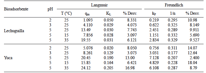 Se consideró que el modelo que mejor interpretó los datos experimentales fue aquel que presentó el menor porcentaje de desviación. Bajo este criterio, el modelo de Langmuir ajustó mejor 9 de los 10 casos de estudio, así que con este modelo se decidió interpretar los datos del equilibrio de bioadsorción de Pb (II) sobre ambos materiales.