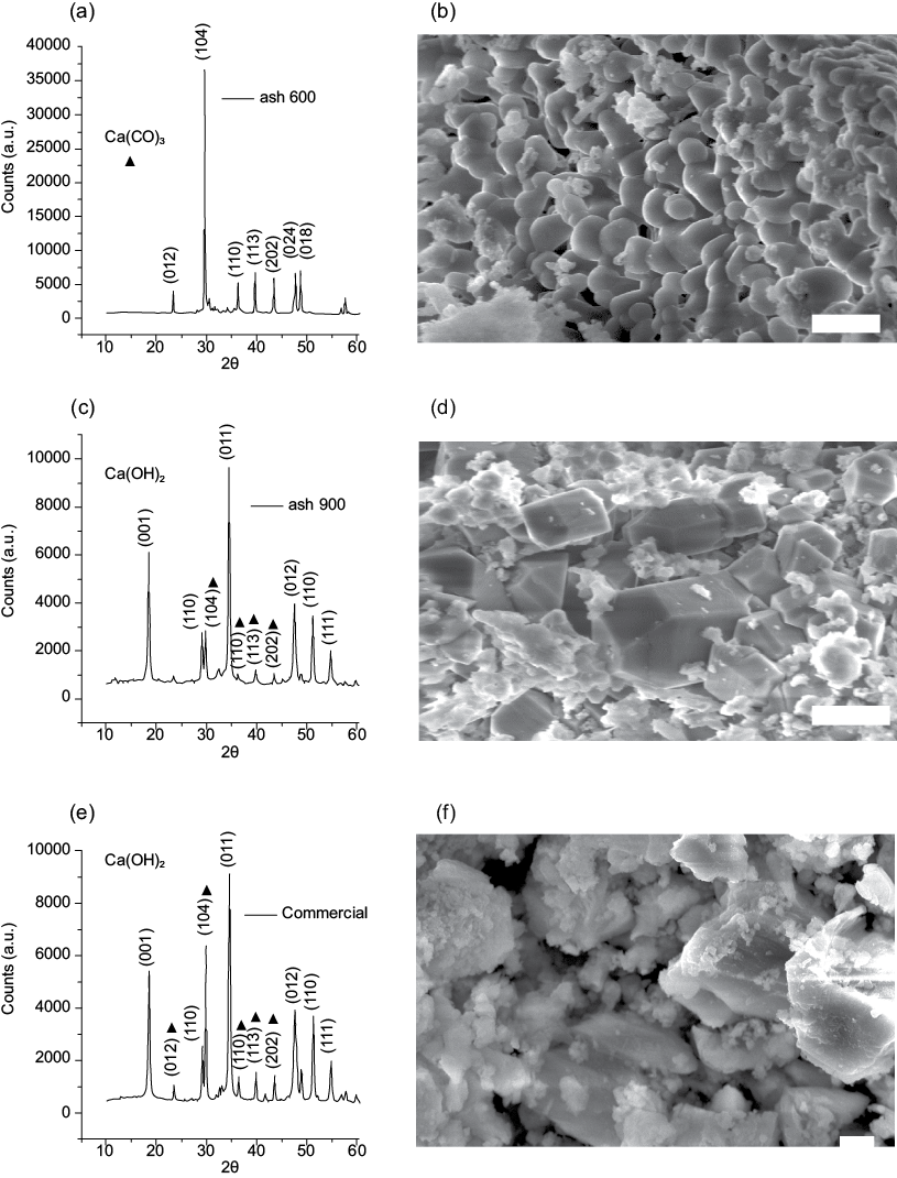 In figure 1b the original structure of the Agave fibers can still be discerned with small semicircular particles, while in ash 900 hexagonal crystals, characteristic of Ca(OH)2 can be observed (Fig. 1d). In figure 1f the commercial sample shows irregular particle shapes, this might be attributed to the use of grinded limestone during the production process of Ca(OH)2. Even if unexpected, the presence of CaCO3 in the bagasse, can be explained by plant physiology, plants are able to break and solubilize rock by excreting acidic compounds in root exudates (Bashan et al. 2006). This mechanism is used to obtain minerals from poor soils, providing an alternative source of nutrients. As such, this natural occurring mechanism could be exploited for the extraction of several compounds of economic interest, once the biomass has been used in the tequila manufacturing process.