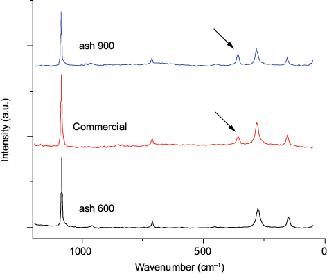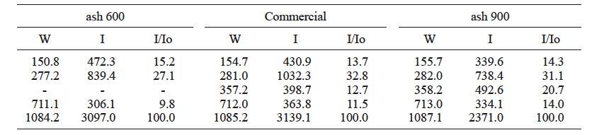 Figure 2 shows the Raman spectra of ash 600 displaying the four characteristic peaks of CaCO3, while for the spectrum of ash 900, besides the expected peaks (Table I), displays an additional peak at 358 cm–1, suggesting the presence of hydrated lime (Tlili et al. 2002, Schotsmans et al. 2014). The Raman spectra of the commercial sample shows identical peaks to those obtained for Ca(OH)2. As it can be observed in the XRD patterns, both ash 900 and commercial samples contain a mixture of Ca(OH)2 and CaCO3, even though the peaks in the Raman spectra are similar in the samples of CaCO3 and Ca(OH)2. The explanation for this peak at 358 cm–1 is the presence of hydrated lime. Calculating the relative intensity (I/Io) of the peak associated to the hydrated lime (358 cm–1), it is possible to study the carbonation of Ca(OH)2 samples as shown in table I.