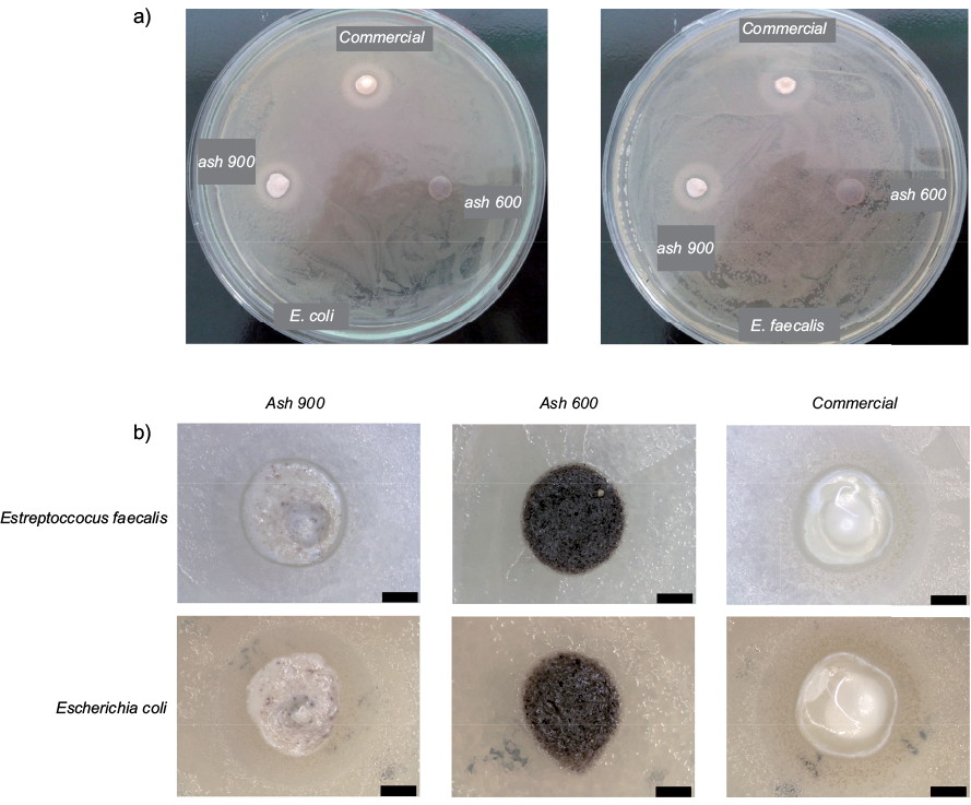 For the agar diffusion assay, after a 24 h incubation, E. coli and E. faecalis were observed covering the agar plate surface, displaying inhibition halos surrounding both samples of Ca(OH)2 ash 900 and commercial sample, while no effect was observed for calcium carbonate (ash 600), as it can be seen in figure 3a-b. In figure 3b, an amplification of the inhibition halo is presented. For E. faecalis, the width of the halo is about the same for commercial sample (1.7 mm) and ash 900 (2.1 mm), respectively. The ash 600 sample did not show an effect on bacterial growth, excluding the possibility of an inherent bactericidal activity of unprocessed ash.