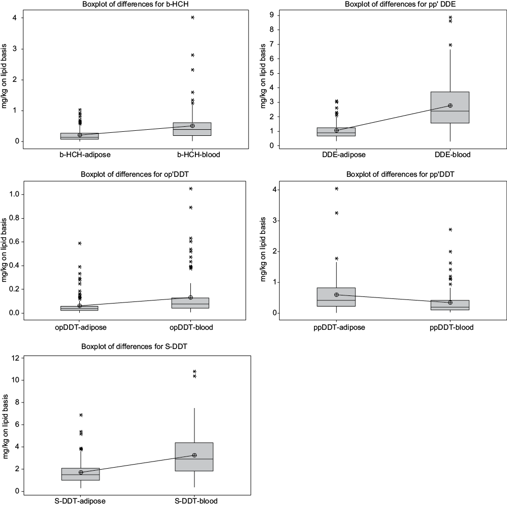 Among the organochlorine pesticides determined in the study, higher concentrations correspond to b-HCH, pp’DDE and op’DDT in blood serum lipids. Only pp’DDT manifested higher concentrations in adipose tissue lipids when compared to blood serum lipids. The boxplot of differences between samples are exhibited in figure 1. On the other hand, when applying a Pearson test to determine the correlation between organochlorine pesticide concentrations in binomial samples (adipose tissue and blood serum), the following results were obtained: b-HCH-adipose tissue and b-HCH-blood serum r = 0.721, p = 0.000; pp’DDE-adipose tissue and pp’DDE-blood serum r = 0.552, p = 0.000; op’DDT-adipose tissue and op’DDT-blood serum r = 0.747, p = 0.000; pp’DDT-adipose tissue and pp’DDT-blood serum r = 0.686, p = 0.000; S-DDT-adipose tissue and S-DDT-blood serum r = 0.622, p = 0.000. Higher values of the Pearson correlation factor suggest that organochlorine pesticide concentrations in adipose tissue are positively correlated to that in blood serum. The calculations reveal that estimated values of organochlorine pesticides in blood serum compartment are inversely proportional to adipose tissue concentrations. This is because the tissue elimination function slowly saturate the organism with these pesticides within a monitored range of concentrations. A high level of correlation between concentrations for individual organochlorine pesticides and these two matrices would indicate a degree of interchangeability of lipids among tissues and their copartition between both body compartments.