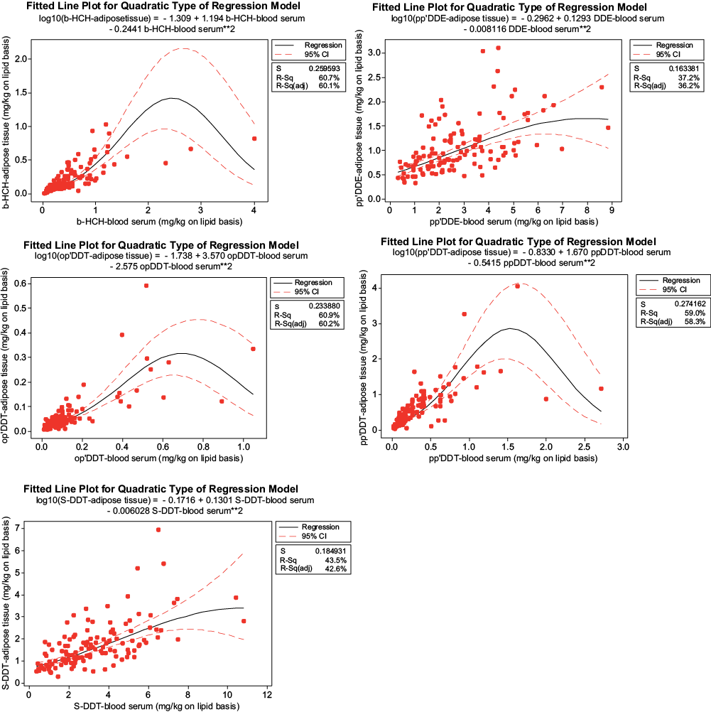 Lipid correction or adjustment of organochlorine pesticides concentrations is option to deal with the lack of information on fasting status of participants, in other words, it expresses the organochlorine pesticide levels by total lipid concentrations when the bias that may cause ignorance of fasting status is potentially much higher than the bias that could cause the influence of these pesticide levels expressed on lipid basis (López et al. 2014, Caba et al. 2015). As a result, we chose the quadratic type of regression model to model the curvature in the relationship between a response variable (Y) and a predictor variable (X), by extending the simple linear regression model (Fig. 2 and Table II). The polynomial regression analysis calculates the p = 0.000 which suggests that the adipose tissue is a significant predictor of blood serum in organochlorine pesticide concentrations, and the higher coefficient of regression value tells us about the amount of variability in the response that this model accounts for. The quadratic model applied (p = 0.000) appears to provide a good fit to the data, and the coefficient of regression shows that the adipose tissue concentrations indicate the variation in log10 of blood serum in organochlorine pesticide contents. A visual inspection of the plot presented in figure 2 shows that data are evenly spread along the regression line, implying there is no systemic lack of fit.