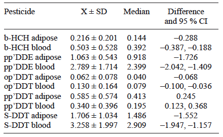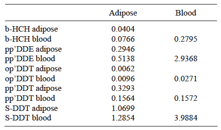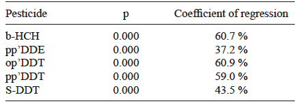 In order to display the relationship between blood lipids and adipose tissue lipids in organochlorine pesticide concentrations, analysis of covariance was measured. The results obtained are presented in table III, indicating high concentrations of organochlorine pesticides in blood lipids, and a linear association between concentrations determined in serum and adipose tissue lipids, expressed by coefficient of regression and lower p values (p < 0.01).