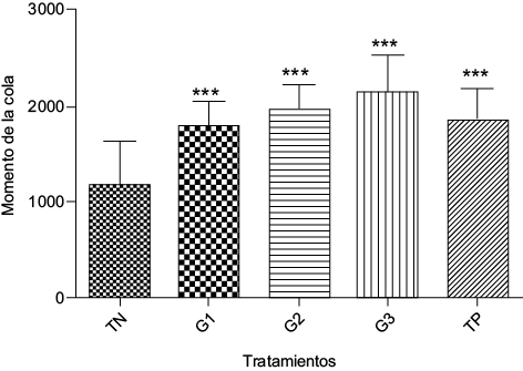 En la cuadro I se resumen los valores obtenidos mediante el ensayo cometa para el parámetro seleccionado (momento de la cola) como medida de daño inducido en el ADN. Todas las concentraciones de glifosato en formulación comercial produjeron un aumento estadísticamente significativo del momento de la cola respecto al testigo negativo (Fig. 1).