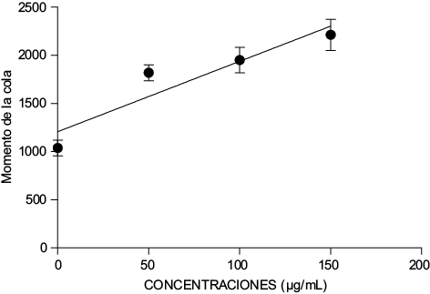Se observó una correlación positiva entre el momento de la cola y las distintas concentraciones de glifosato, con un r = 0.9342 y p = 0.043 para el coeficiente de correlación de Pearson (Fig. 2).
