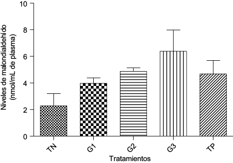 Se procedió a determinar las sustancias reactivas al ácido tiobarbitúrico mediante el método descrito por Buege y Aust (1978), modificado por Marcinčák et al. (2003) en plasma de sangre periférica humana. Éste se obtuvo luego de la primera centrifugación de la sangre expuesta a los distintos tratamientos para la realización del ensayo cometa (previo al aislamiento de linfocitos) y se conservó a –20 ºC hasta la cuantificación de TBARS.