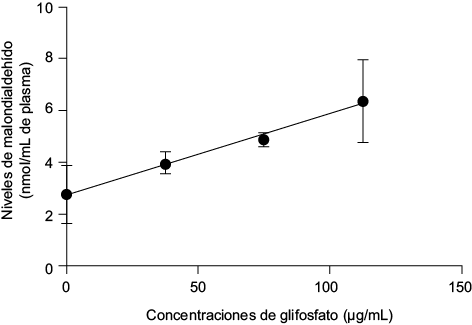 En la figura 3 se presentan los valores correspondientes a la determinación de sustancias reactivas al ácido tiobarbitúrico (TBARS) en plasma de sangre periférica humana expuesta a glifosato.