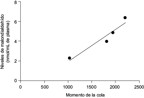 Por último, se encontró una correlación r = 0.9590 entre el daño al ADN cuantificado mediante el ensayo cometa y la evaluación del estado redox mediante TBARS (Pearson, p < 0.05; Fig. 5).