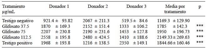 Con base en las concentraciones utilizadas por Mañas et al. (2009a, b) para glifosato puro, se realizaron ensayos previos para determinar la citotoxicidad y viabilidad de los leucocitos. Se decidió utilizar tres concentraciones finales de glifosato en formulación comercial (glifosato II Atanor®): 37.5, 75 y 112.5 µg/mL en amortiguador de fosfato salino (PBS, por sus siglas en inglés) como disolvente. En dichas formulaciones comerciales la viabilidad determinada mediante coloración con azul tripano (Freshney 2000), fue mayor a 95 %. Las concentraciones varían entre 56 y 170 veces menos que las recomendadas para pulverizaciones aéreas por la empresa que produce el herbicida.