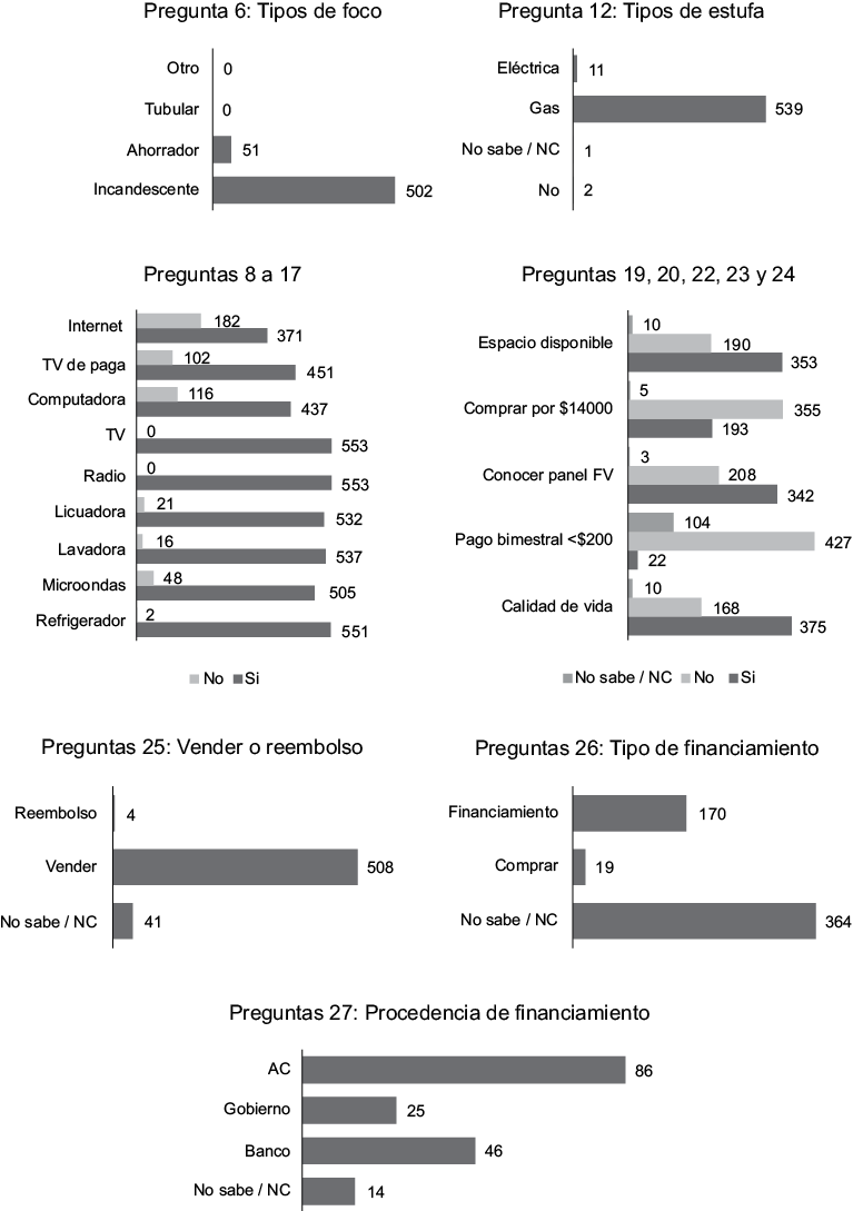 La sección referente a la tecnología FV se ilustra en las preguntas 19, 20, 22, 23 y 24. En primer lugar, poco más de la mitad de la muestra considera que su calidad de vida sí se ve afectada por las fallas eléctricas. Sumado a eso, la gran mayoría paga más de MXN$ 200 al bimestre. Sin embargo, más de la mitad no conoce ni ha oído hablar sobre la energía solar o los paneles FV. Cabe resaltar que 353 viviendas cuentan con espacio disponible para instalar un sistema FV, pero al parecer más de la mitad no invertiría MXN$ 14 000 en él.