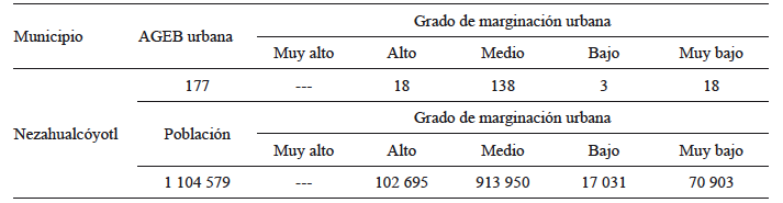 Este indicador se define como la dificultad de propagar el progreso técnico, así como la exclusión del proceso de desarrollo y sus beneficios en una comunidad. Nezahualcóyotl ha registrado un grado más bajo de marginación comparado con el indicador estatal, con un índice de -1.75 contra -0.6 respectivamente (GEDOMEX 2012). Las AGEB urbanas en promedio indican un nivel de marginación medio (Cuadro I).
