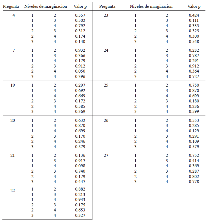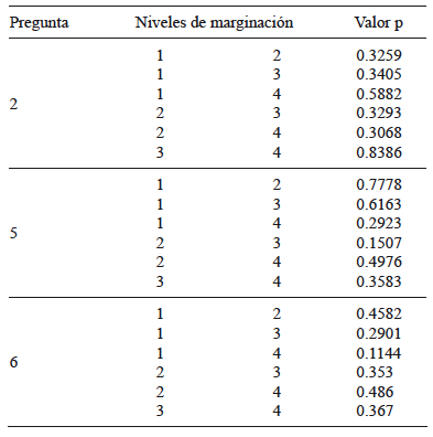 Se verificó la diferencia entre las muestras del primer bloque por nivel de marginación. Para ello se realizó una prueba de Kruskal-Wallis entre cada grupo de variables, tomando las muestras como los niveles de marginación (Cuadro VII). Entonces, es probable que las medias de los grupos de la encuesta por nivel de marginación sean estadísticamente indistinguibles y provengan de la misma población.