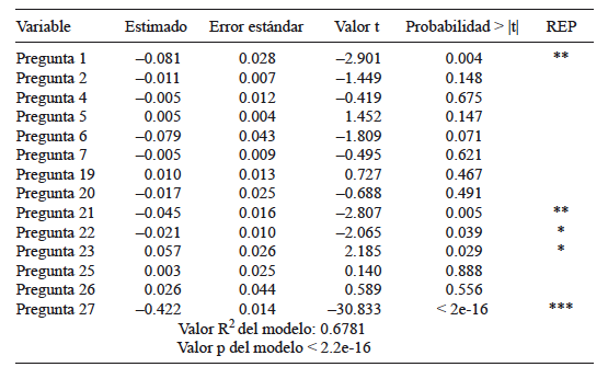 Los resultados muestran que el modelo explica 67 % de la variación de la variable dependiente. Además, existe una relación significativa entre las variables del modelo de regresión (p < 0.05; Cuadro XI).