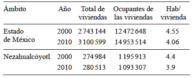 La Comisión Nacional de Vivienda (CONAVI) considera una vivienda “carente” si presenta al menos una de las siguientes características: piso de tierra, techo de lámina o cartón y/o muros de materiales no duraderos. En 2010, en Nezahualcóyotl hubo en promedio 3.9 hab/vivienda (Cuadro II; GEDOMEX 2012). Para 2010 las viviendas con electricidad tuvieron el 98 % de cobertura (GEDOMEX 2012).