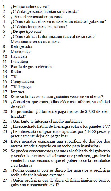 Para determinar el tamaño de la muestra, la vivienda se desempeñó como entidad compleja para ser el elemento muestral, pero el elemento para definir el tamaño de la muestra fue la cantidad de individuos que habitan en la vivienda. De esta manera, las 27 preguntas que se realizaron abarcaron las características sociotécnicas de la vivienda, así como la toma de decisiones dentro de la misma (Cuadro III). Por lo tanto, el grupo preferencial a encuestar fueron personas mayores de edad con la facultad de tomar decisiones económicas para la vivienda.