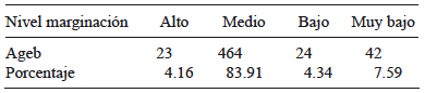 Los niveles de marginación se clasificaron con un numeral: alto = 1, medio = 2, bajo = 3 y muy bajo = 4.