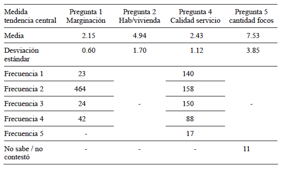 Se obtuvo que el promedio del nivel de marginación en el municipio fue 2.15, que se considera nivel medio de marginación (Cuadros V y VI), esto coincidió con la información estadística oficial. Para la pregunta 4, la calificación de la calidad del servicio de electricidad del gobierno, la media fue 2.43, que indica insatisfacción en la población encuestada. La media de focos por vivienda fue 7.43, esto quiere decir que las casas encuestadas gozan de servicio eléctrico adecuado para poseer esa cantidad de focos, aunque también es un indicador del nivel de marginación, del cual se aprecia un nivel medio y alto de acceso a los servicios de iluminación.